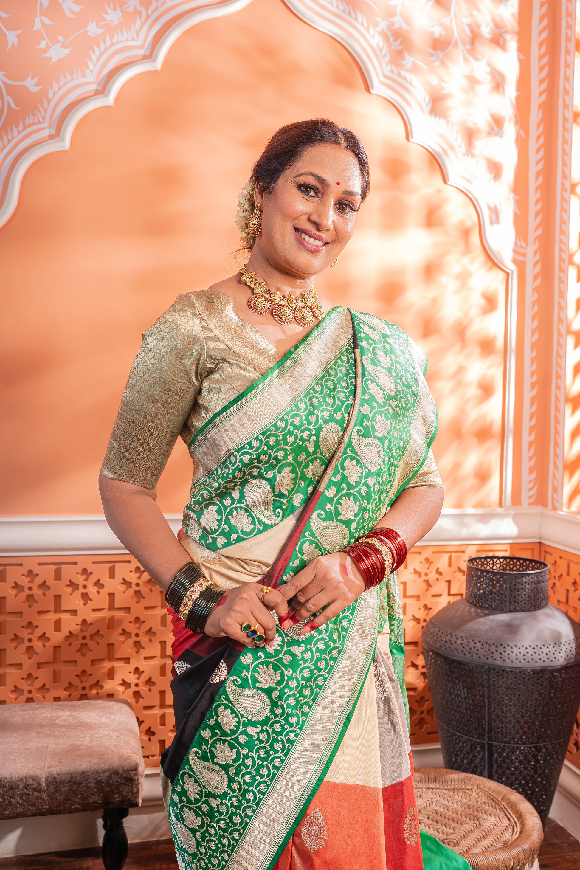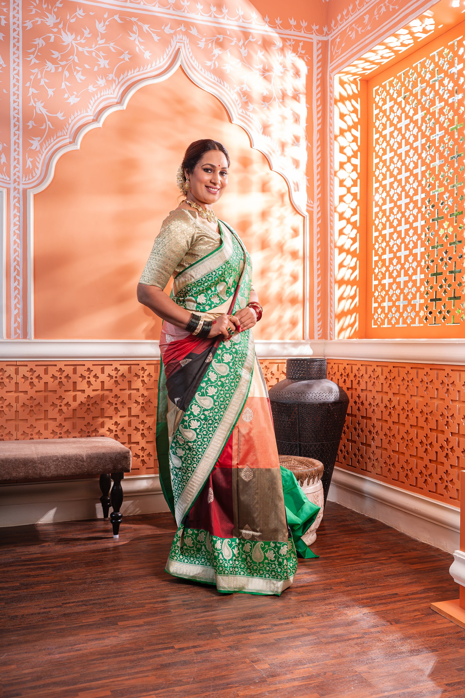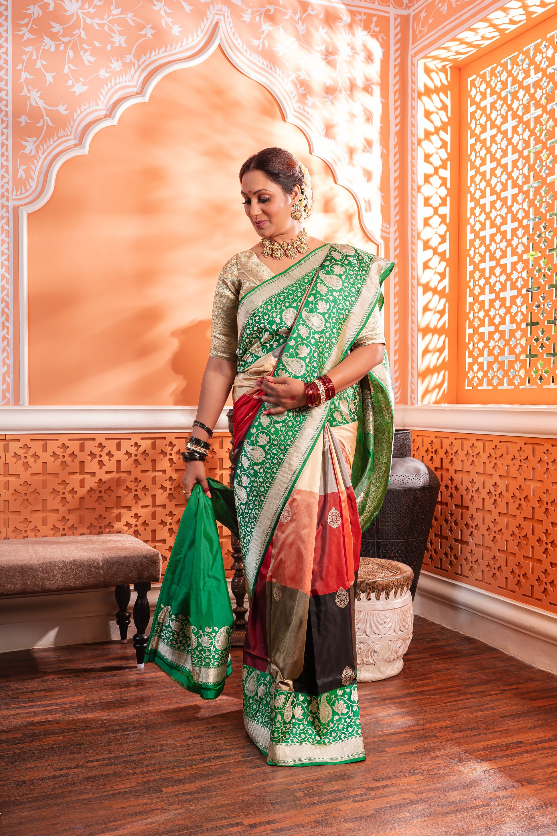 Crafted with the luxurious Jamdani technique, this saree features a vibrant mix of green, red, and black hues with a shimmering zari brocade