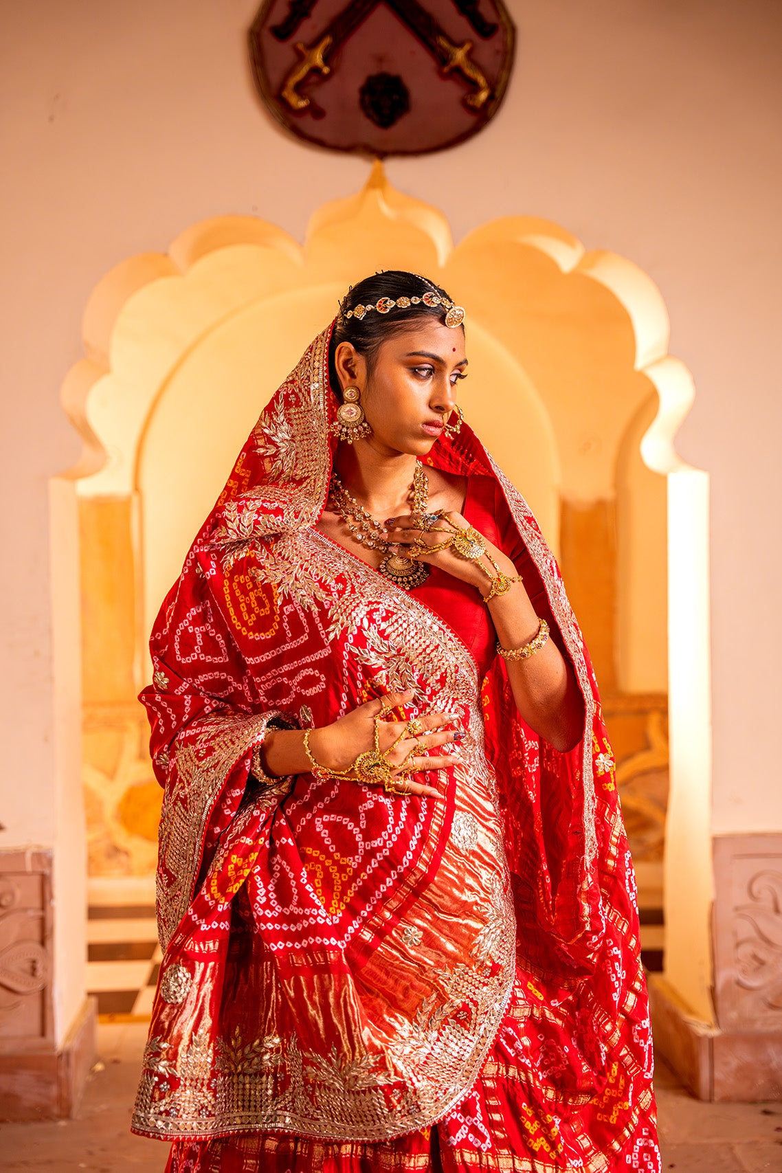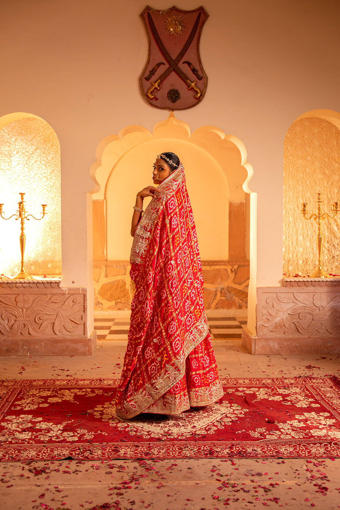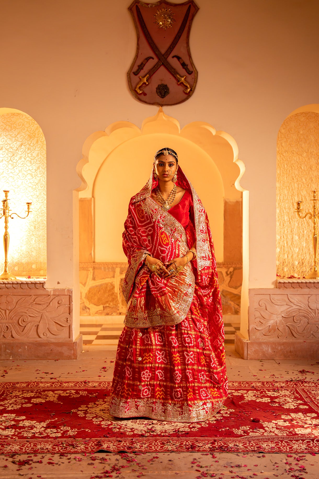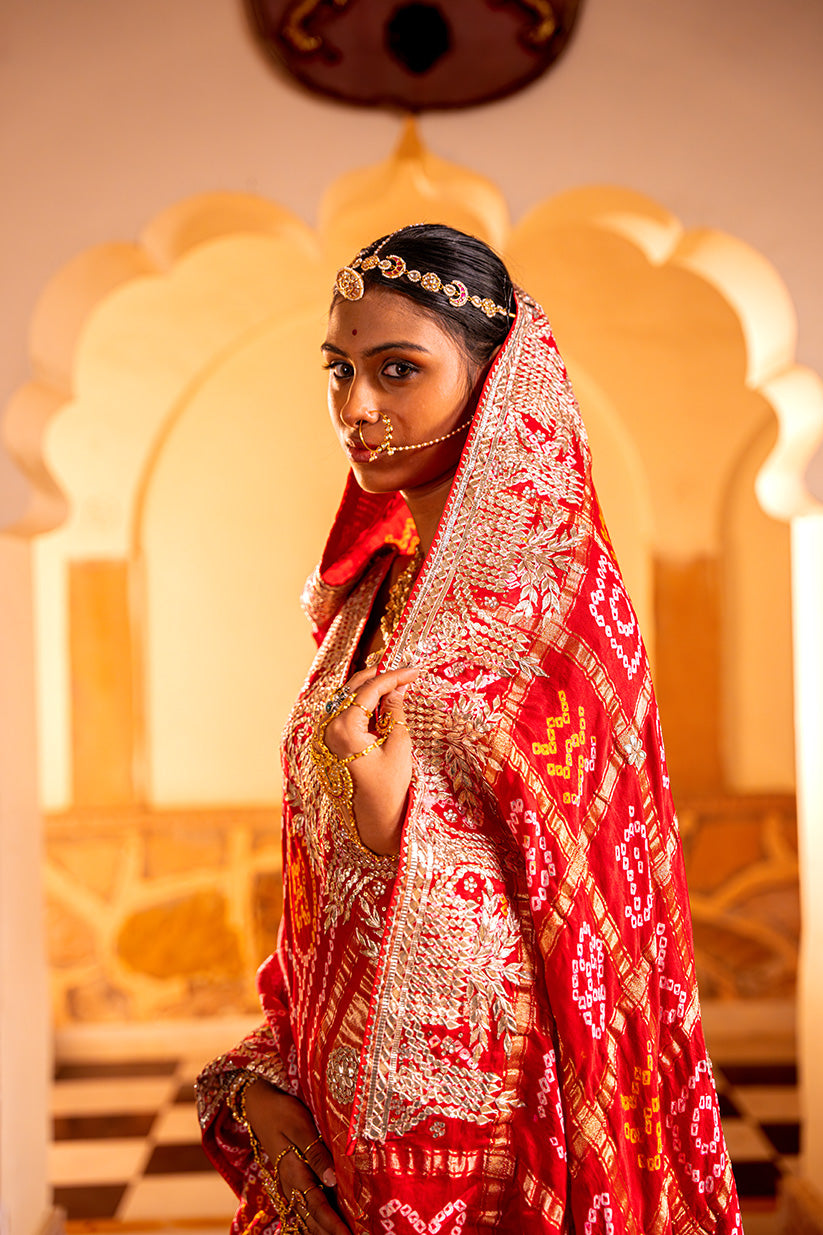 This exquisite Red Bandhej saree in rich Gajji silk is a timeless expression of tradition and elegance. Highlighted with delicate gota patti handwork, it beautifully blends heritage with sophistication, making it perfect for weddings, festive occasions, or cherished celebrations.