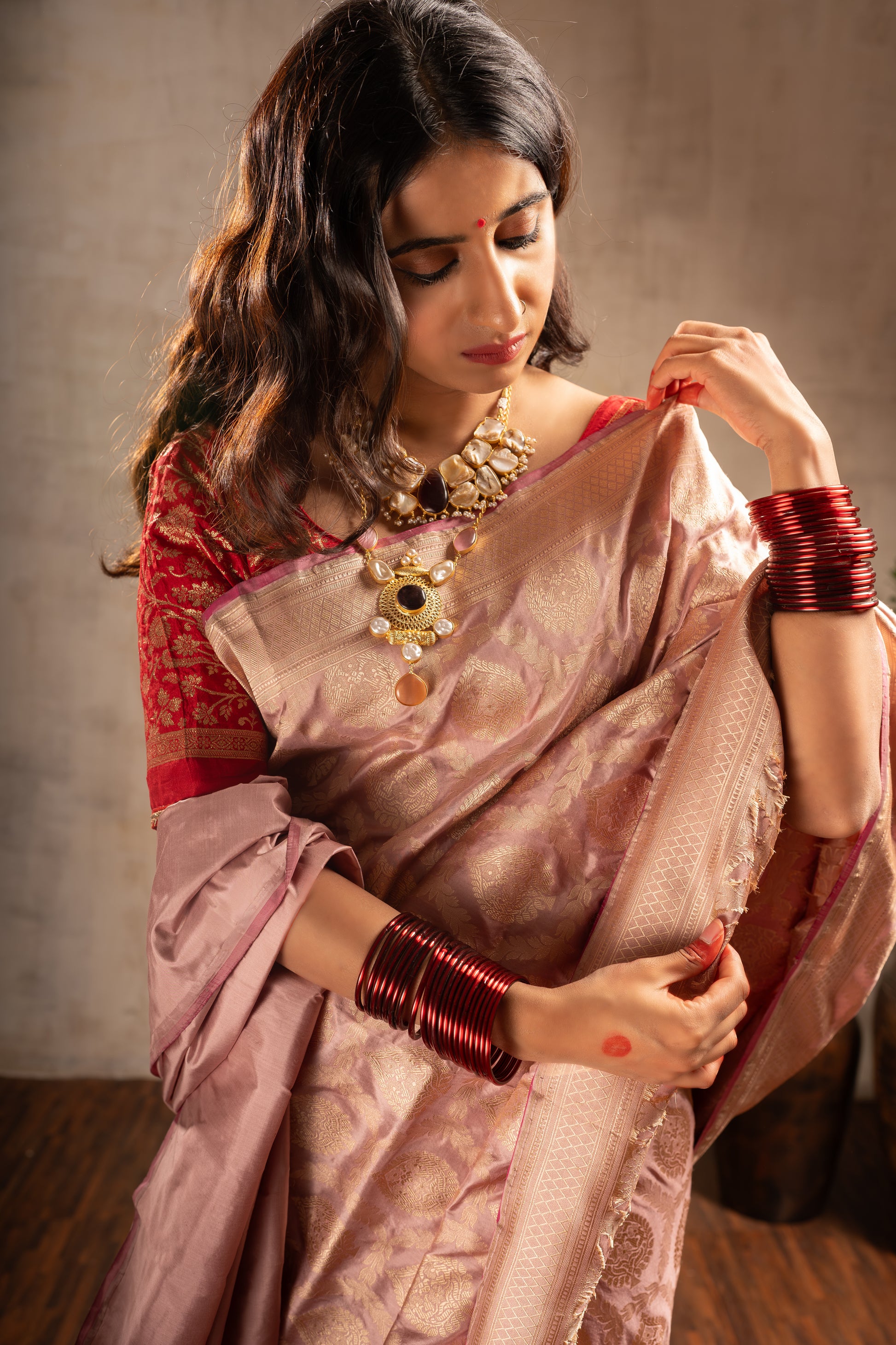 This Rose Gold JAMDANI SILK Banarasi Katan Saree features graceful infusion of floral vines throughout the body and a distinct floral border with stripes on either side of it
