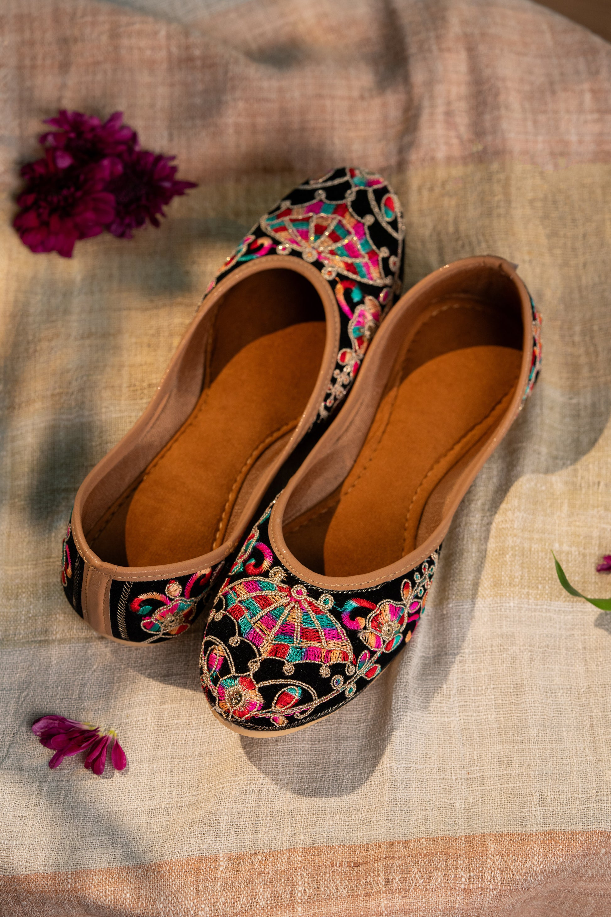 blacked based jutti with the machine embroidery of umbrellas and flowers around, is perfect for your everyday wear.