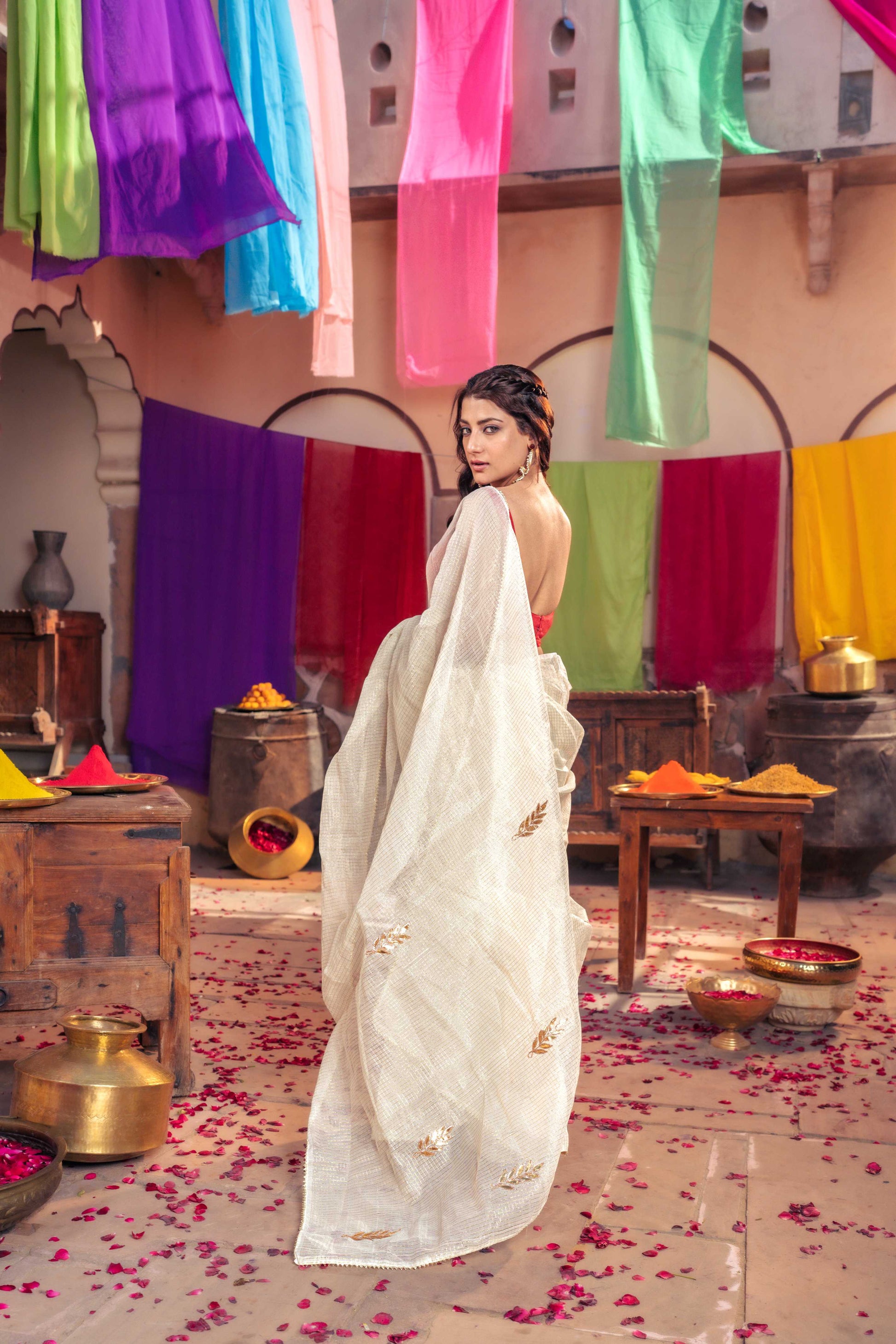 Ethereal in ivory and gold, this Kota Doria saree is a perfect blend of simplicity and grace. Its airy weave drapes effortlessly, while delicate Gota Patti Butta adds a touch of heritage charm.