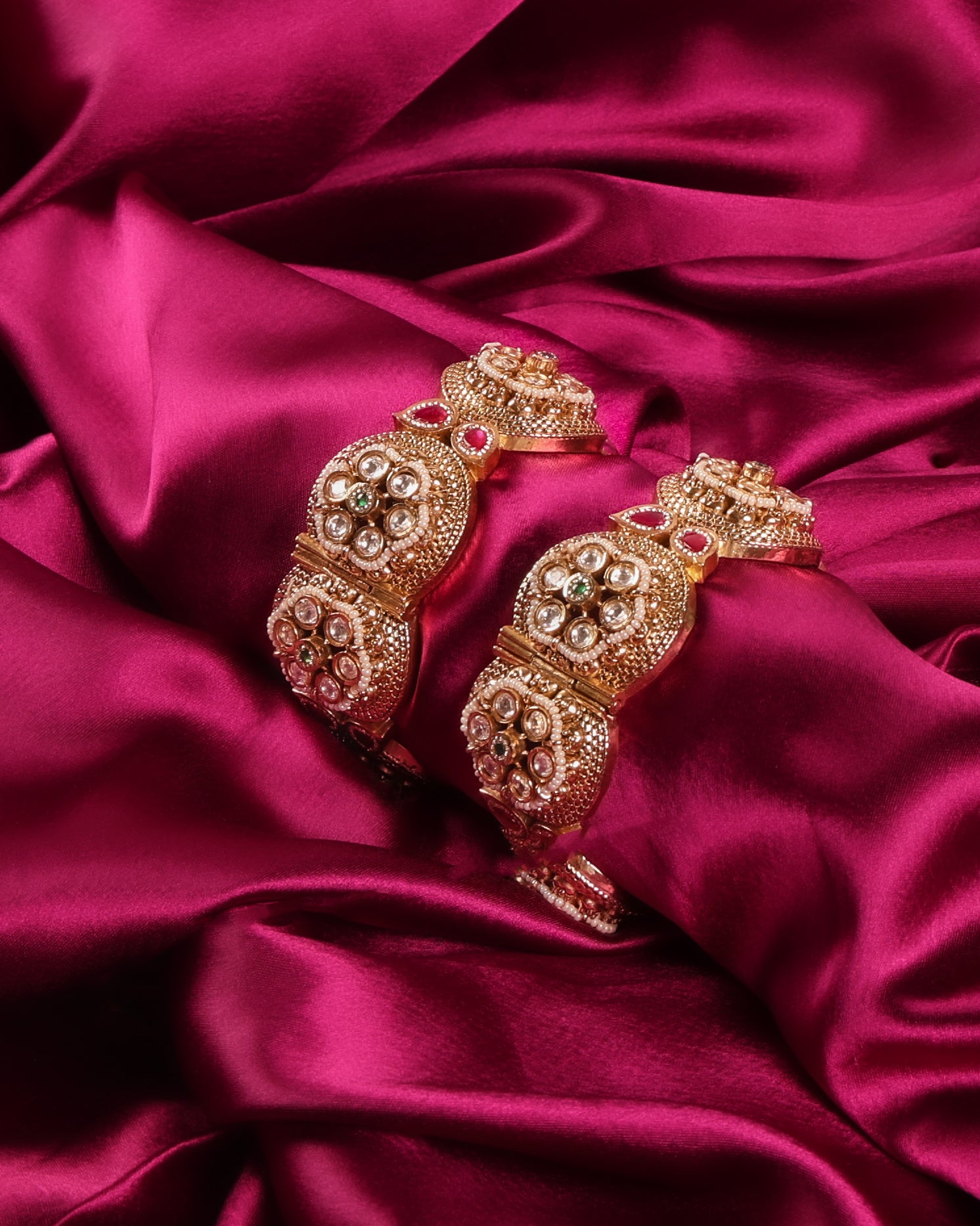 A beautiful pair of Bangles with a classic combination of Kundan and jadau. The Bangles come in colourful enamel where detailing meets the sparkle of Kundan in this exquisite kangan.