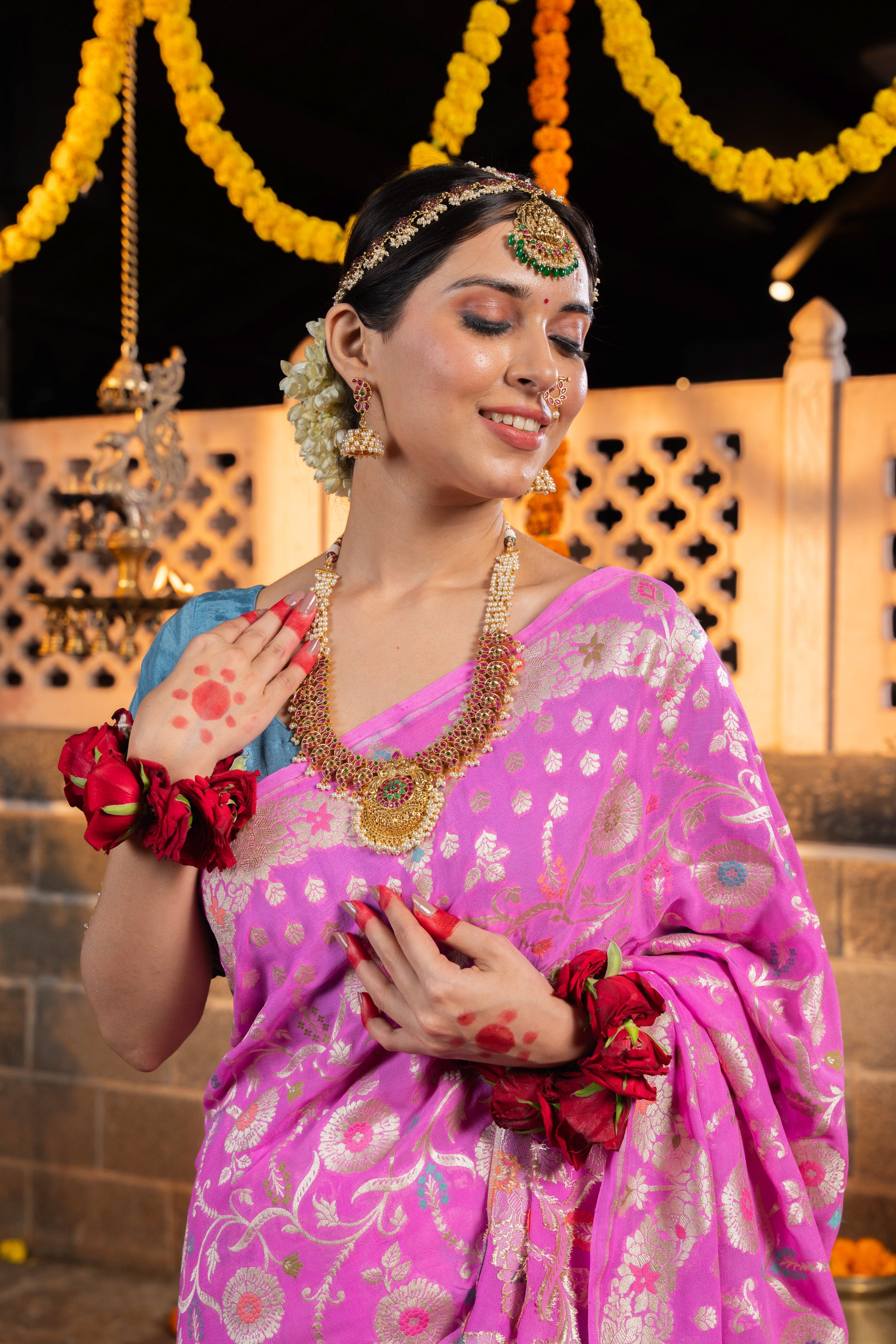 • Store garment in a muslin cloth in a dry environment, as the zari tends to react to the weather changes.