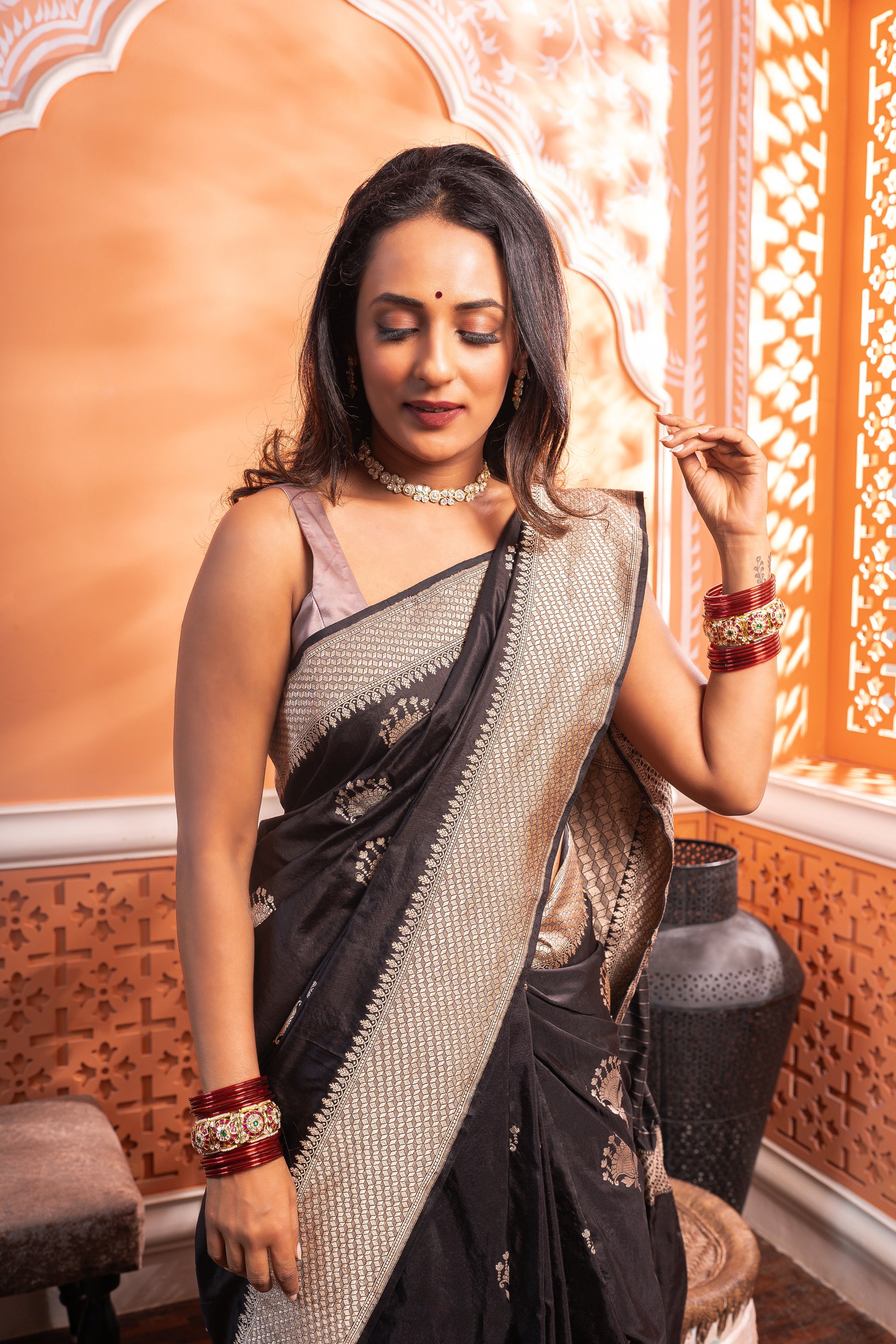 • Store garment in a muslin cloth in a dry environment, as the zari tends to react to the weather changes.