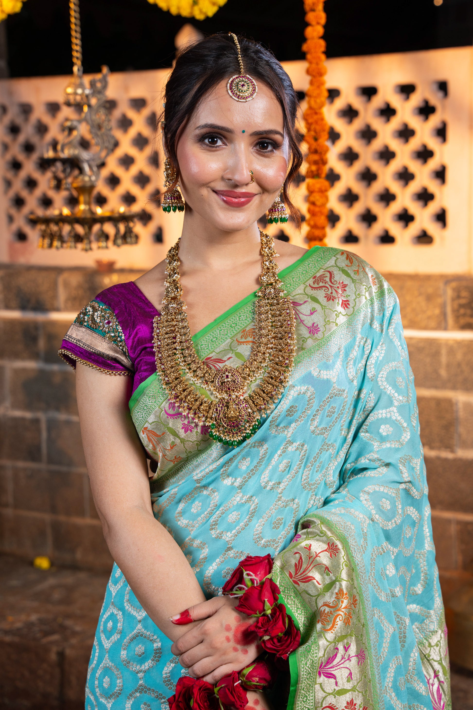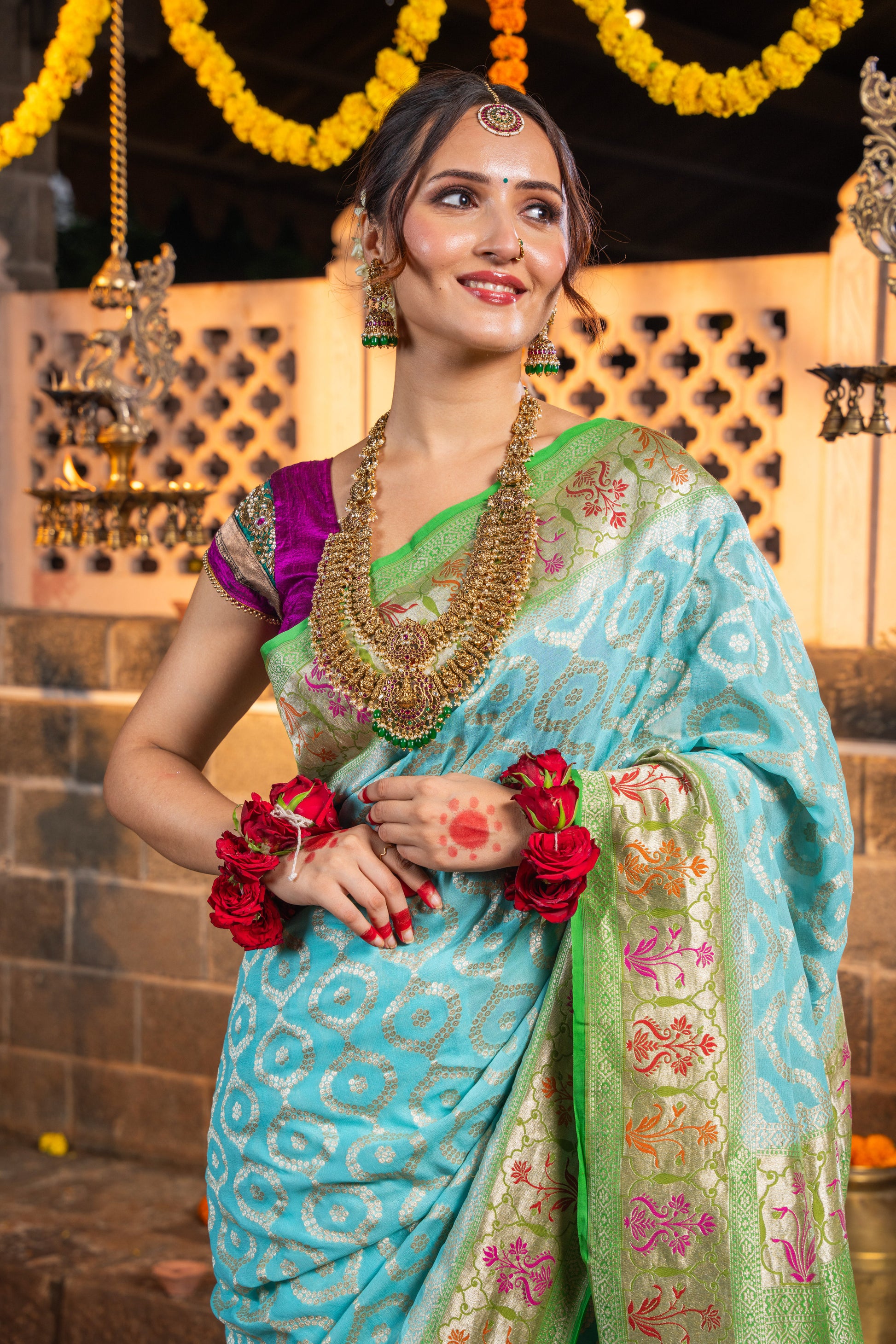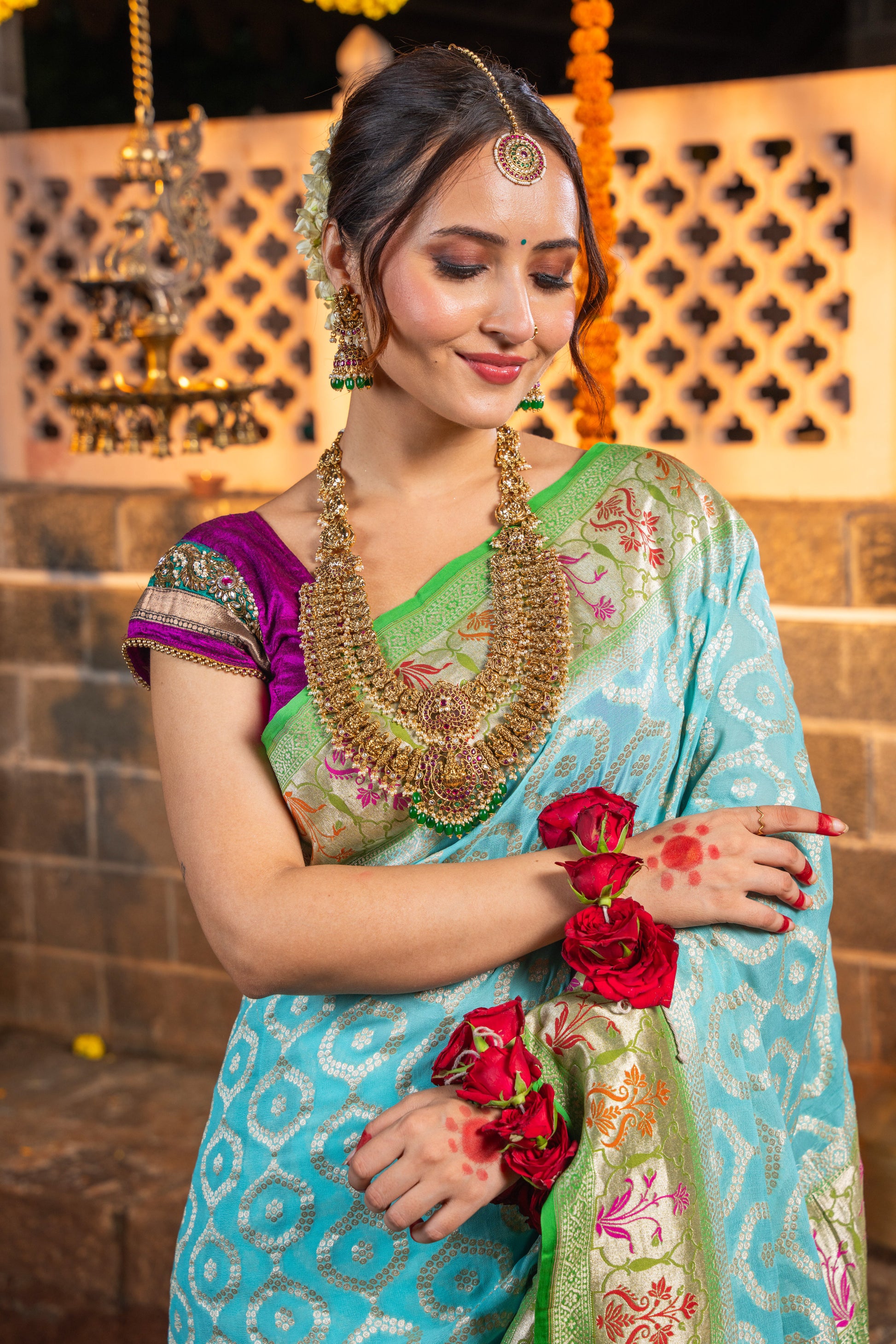 • Store garment in a muslin cloth in a dry environment, as the zari tends to react to the weather changes.