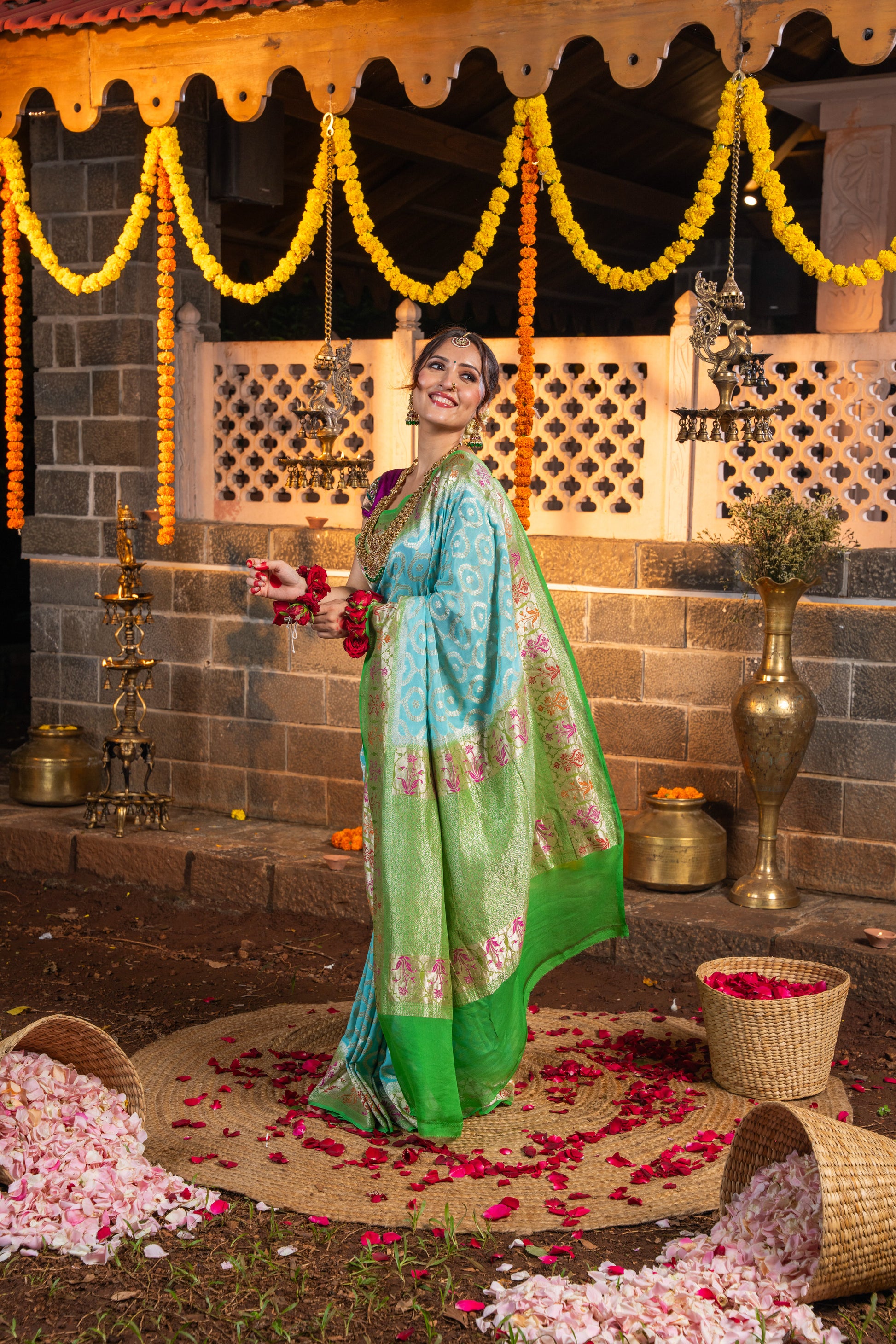 Crafted with timeless nature-inspired, handwoven with zari all over, this alluring drape is crafted in Kadua silk. Elevated in floral motifs and beautiful meenakari this saree is for the woman who embraces her roots.