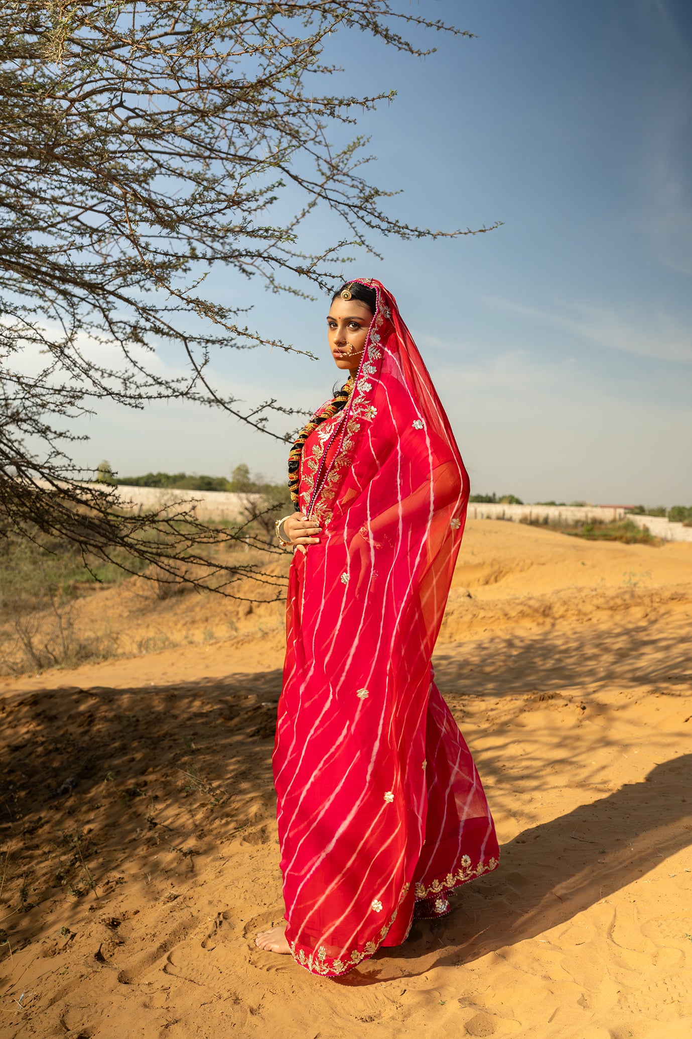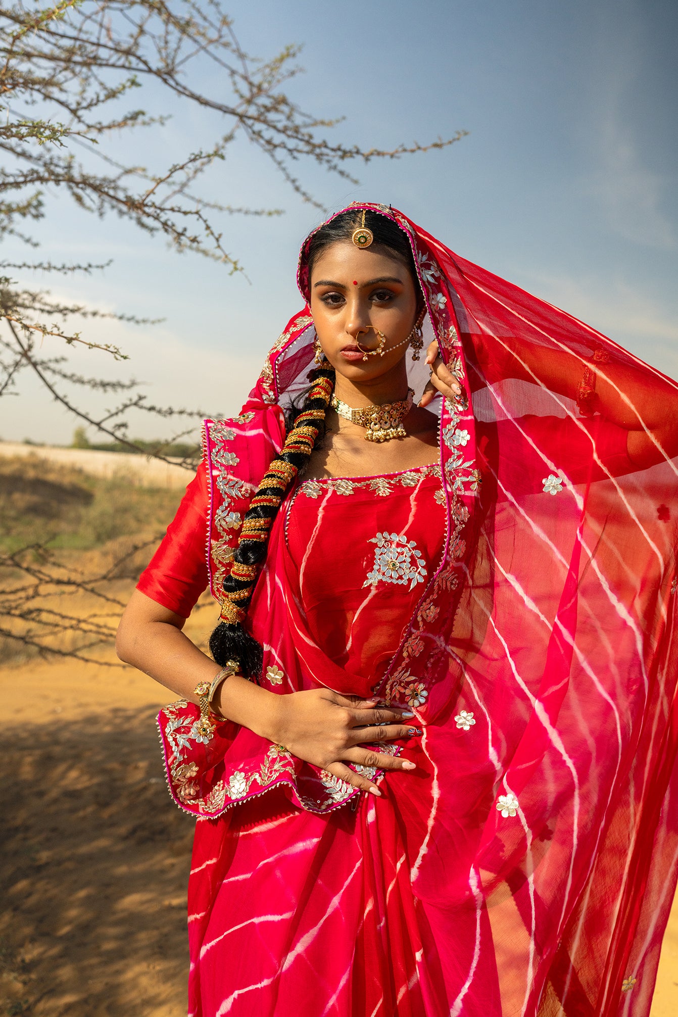 A beautiful play of red Leheriya patterns on soft, flowy chiffon. Light as air, this saree features delicate gota patti buttas all over, adding just the right festive touch. Comes with an unstitched blouse piece.
