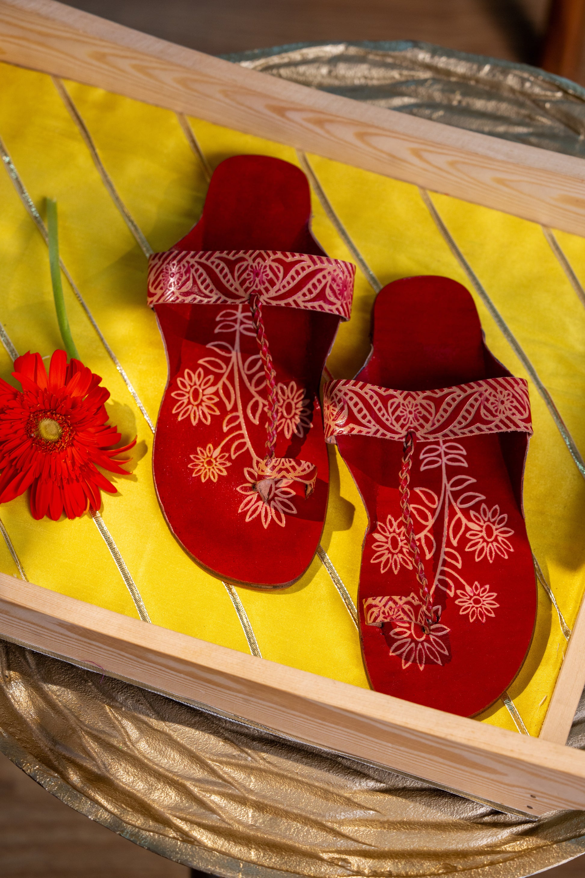 Your perfect festive/wedding kolhapuri sandal, handcrafted in celebratory colours of gulaabi red and marigold orange