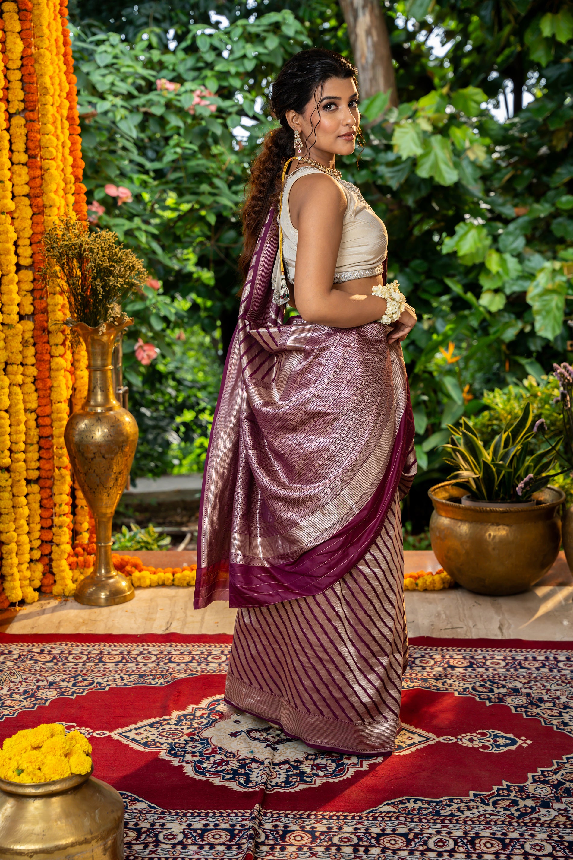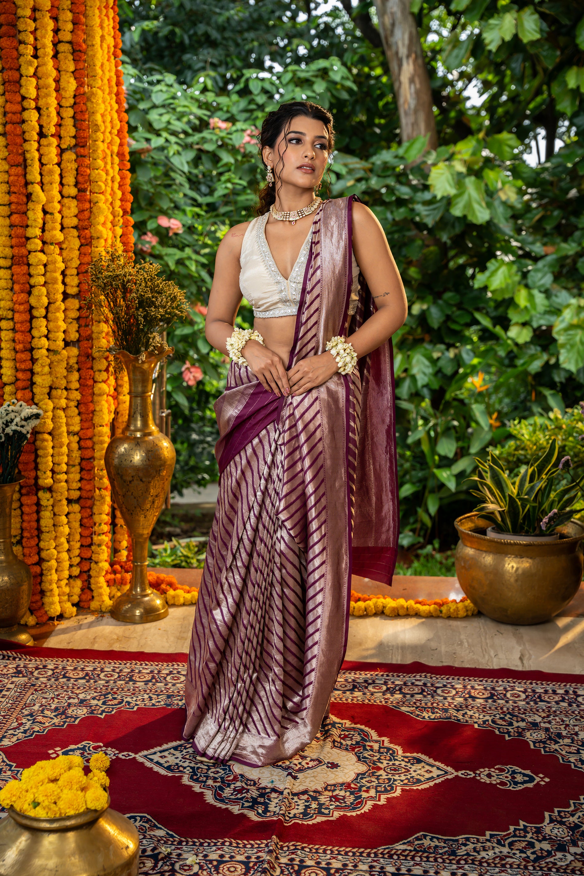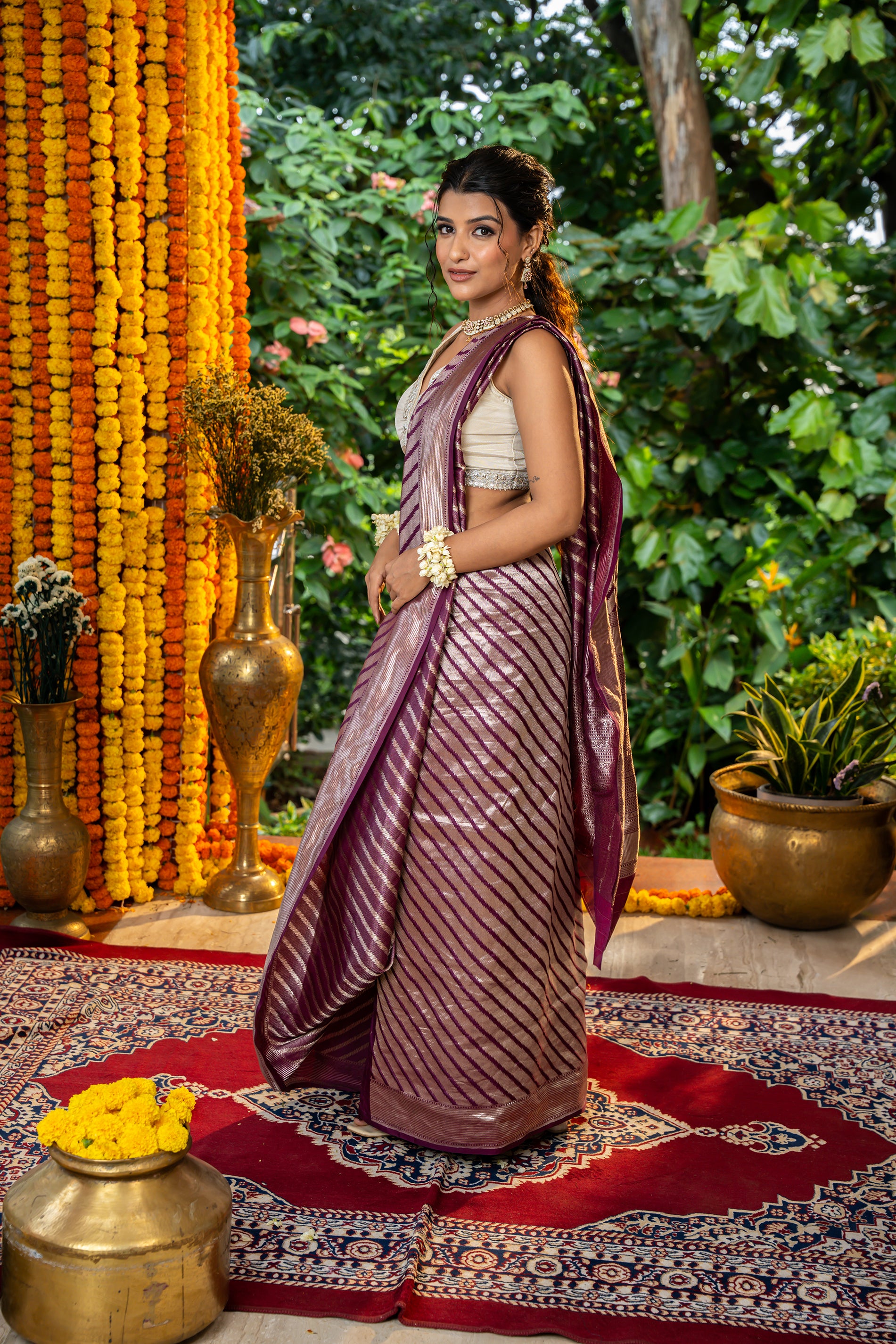 Mauve Striped Banarasi silk saree featuring golden and mauve hues with a graceful leheriya pattern. A blend of heritage and elegance, crafted for festive and special occasions. Comes with an unstitched blouse piece.